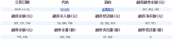 金隅股份(601992)2016-11-21融資融券信息顯示,金隅股份融資余額307,127,704元,融券余額775,476元,融資買入額20,890,786元,融資償還額20,262,915元,融資凈買額627,871元,融券余量165,700股,融券賣出量57,400股,融券償還量0股,融資融券余額307,903,180元。金隅股份融資融券詳細(xì)信息如下表: