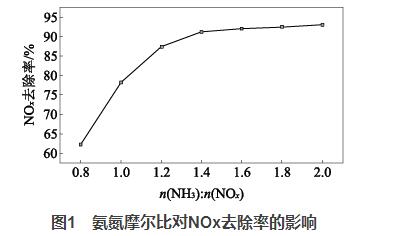 由圖1可見,NOx去除率隨氨氮摩爾比即n(NH3):n(NOx)的增加而逐漸提高,這是因為隨n(NH3):n(NOx)的增加,將有更多的NH3可以與煙氣中的NOx反應,促使更多的NOx轉(zhuǎn)化為N2和H2O。當n(NH3):n(NOx)小于1.4時,NOx去除率提高的速度較快;當n(NH3):n(NOx)等于1.4時,NOx去除率達到90%以上。繼續(xù)增加n(NH3):n(NOx)至大于1.4時,NOx去除率增加緩慢,這是因為此時煙氣中大部分NOx已被還原,再增加NH3的量,對去除率影響不大。故綜合考慮成本因素與去除率的平衡,n(NH3):n(NOx)為1.2左右比較合適。