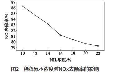 在n(NH3):n(NOx)為 1.2,噴射高度為8m,噴射角度為60°,噴射壓力為0.4MPa,噴射速率為40m/s的條件下,稀釋后氨水質(zhì)量百分比濃度對NOx 去除率的影響見圖 2。