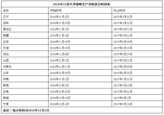 各地各企業(yè)對錯峰生產(chǎn)的重視達到了前所未有的程度,所涉及省市自治區(qū)馬上行動,很快根據(jù)各自情況,因地制宜出臺實施文件,拿出了操作性極強的措施,有的地區(qū)甚至細化到點明哪一家企業(yè)的哪一條生產(chǎn)線應該關停。與此同時,各地的文件都部署了詳細的保障執(zhí)法措施和督查追責辦法。到目前為止,已經(jīng)落實2016年15省冬季錯峰生產(chǎn)實際執(zhí)行時間表:
