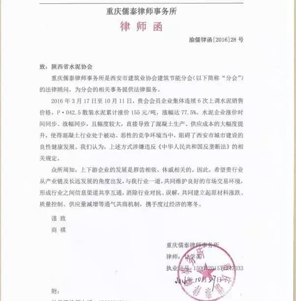 無獨(dú)有偶,今年10月份,西安水泥價(jià)格暴漲,引起了西安地區(qū)混凝土生產(chǎn),供應(yīng)成本的大幅提升,使得當(dāng)?shù)鼗炷列袠I(yè)處于被動(dòng)地位,西安市建筑業(yè)協(xié)會(huì)建筑節(jié)能分會(huì)認(rèn)為這一市場情況違反了《中華人民共和國反壟斷法》的相關(guān)規(guī)定,向陜西省水泥協(xié)會(huì)發(fā)律師函。