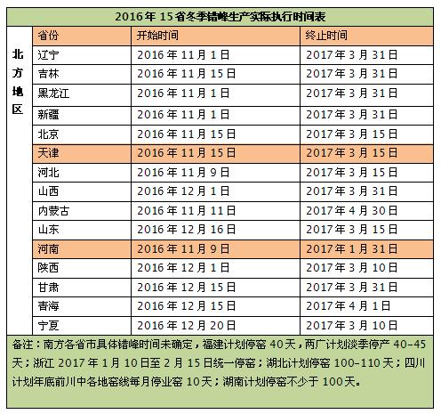 2016年冬季錯峰生產(chǎn)實(shí)際執(zhí)行時間表,供參考,如下: