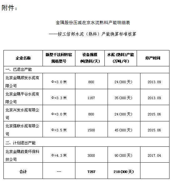 根據(jù)北京市疏解非首都核心功能的工作要求,為進(jìn)一步加快公司產(chǎn)業(yè)結(jié)構(gòu)轉(zhuǎn)型升級(jí),金隅股份計(jì)劃于2017年4月再關(guān)停退出北京前景環(huán)??萍加邢薰?條水泥回轉(zhuǎn)窯生產(chǎn)線(xiàn),該條回轉(zhuǎn)窯產(chǎn)能指標(biāo)為3000噸熟料/天,折合90萬(wàn)噸熟料/年。