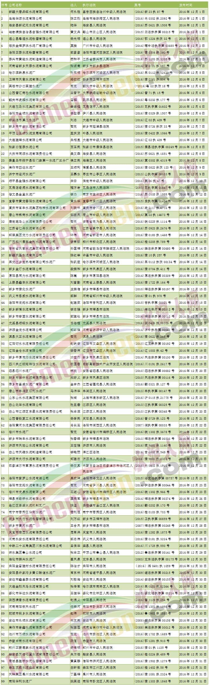 “人無(wú)忠信,不可立于世”,對(duì)于企業(yè)來(lái)說(shuō)也是如此。誠(chéng)信是一個(gè)企業(yè)生存和發(fā)展的基石,很多水泥企業(yè)在發(fā)展的過(guò)程中,往往把誠(chéng)信看得特別重要,但是當(dāng)誠(chéng)信遇上利益之后,很多水泥企業(yè)都是以利為先,誠(chéng)信則被完全忽視,這也是目前很多國(guó)內(nèi)許多小型水泥企業(yè)無(wú)法辦強(qiáng)辦大的原因。據(jù)水泥人網(wǎng)統(tǒng)計(jì),2016年12月被通報(bào)的失信水泥企業(yè)高達(dá)99家,其名單如下: