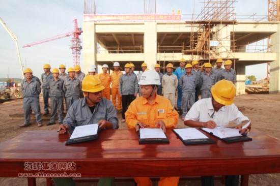 下午5時(shí)18分,馬德望海螺部分干部員工、海螺設(shè)計(jì)院、工程審計(jì)部駐廠人員、海外事業(yè)部駐廠人員、邁世紀(jì)監(jiān)理公司、邯鄲中材項(xiàng)目部、上海寶冶項(xiàng)目部、北京中外運(yùn)等單位參加了安裝工程開工儀式。