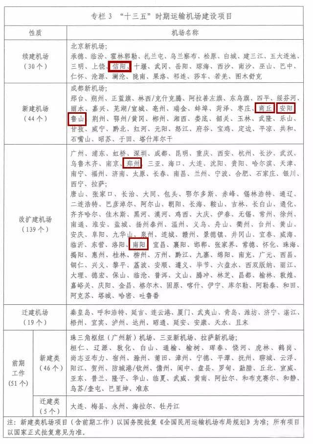 在《規(guī)劃》“十三五”時(shí)期運(yùn)輸機(jī)場建設(shè)項(xiàng)目的表格中,續(xù)建機(jī)場項(xiàng)目有30個(gè),其中包括信陽市續(xù)建機(jī)場項(xiàng)目;新建機(jī)場項(xiàng)目44個(gè),其中包括河南省商丘、安陽、魯山新建機(jī)場項(xiàng)目;改擴(kuò)建機(jī)場項(xiàng)目達(dá)到139個(gè),其中包括河南省鄭州市、南陽市改擴(kuò)建機(jī)場項(xiàng)目。