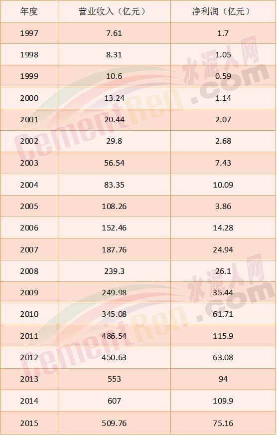 郭文叁時(shí)期(1997-2015年)海螺水泥營業(yè)收入與凈利潤表