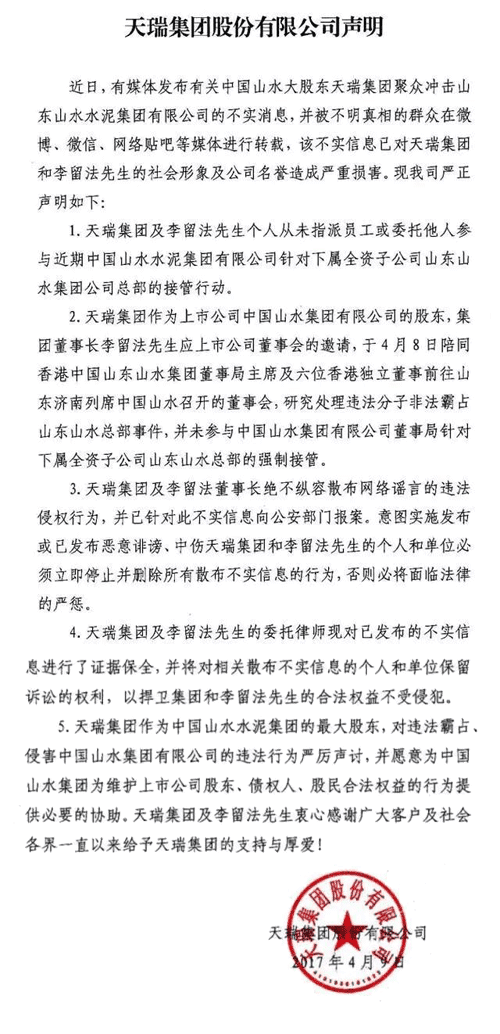 4月8日,天瑞集團(tuán)派600多人襲擊山水總部被水泥人網(wǎng)曝光之后,近40萬(wàn)的閱讀量,進(jìn)一步引爆了行業(yè)的關(guān)注。搜狐、網(wǎng)易、澎湃新聞、21世紀(jì)經(jīng)濟(jì)、央視、鳳凰網(wǎng)紛紛進(jìn)行了轉(zhuǎn)載及相關(guān)持續(xù)報(bào)道。作為當(dāng)事人之一的天瑞集團(tuán)也在4月10日發(fā)表公告稱“天瑞集團(tuán)及李留法先生個(gè)人從未指派員工或委托他人參與近期中國(guó)山水水泥集團(tuán)有限公司針對(duì)下屬全資子公司山水山水集團(tuán)公司總部的接管行動(dòng)。”10日上午,天瑞集團(tuán)發(fā)布聲明予以否認(rèn),李留法先生是應(yīng)上市公司董事會(huì)邀請(qǐng),前往濟(jì)南參加董事會(huì),并強(qiáng)調(diào)“并未直接參與中國(guó)山水集團(tuán)有限公司董事局針對(duì)下屬全資子公司山東山水總部的強(qiáng)制接管”。公告內(nèi)容如下:
