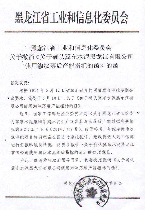 冀東水泥黑龍江新建7200t/d生產(chǎn)線項(xiàng)目為獲得項(xiàng)目批復(fù)落后產(chǎn)能置換指標(biāo)曾兩次涉嫌造假,工信部2014年9月份和2016年3月份曾兩次發(fā)函要求撤銷(xiāo),并擬定做為違規(guī)審批項(xiàng)目的典型在全國(guó)進(jìn)行通報(bào)批評(píng)。