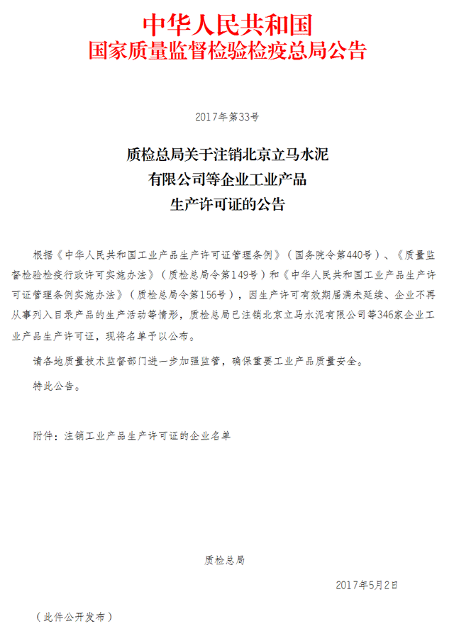根據(jù)《中華人民共和國工業(yè)產(chǎn)品生產(chǎn)許可證管理條例》(國務(wù)院令第440號)、《質(zhì)量監(jiān)督檢驗檢疫行政許可實施辦法》(質(zhì)檢總局令第149號)和《中華人民共和國工業(yè)產(chǎn)品生產(chǎn)許可證管理條例實施辦法》(質(zhì)檢總局令第156號),因生產(chǎn)許可有效期屆滿未延續(xù)、企業(yè)不再從事列入目錄產(chǎn)品的生產(chǎn)活動等情形,質(zhì)檢總局已注銷北京立馬水泥有限公司等346家企業(yè)工業(yè)產(chǎn)品生產(chǎn)許可證,其中水泥企業(yè)共計274家。