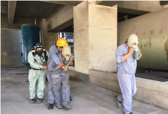 熟料分廠廠長宋杰明擔(dān)任本次應(yīng)急救援演練總指揮,并由救護(hù)組、搶險(xiǎn)組、警戒組、現(xiàn)場清理組和后勤保障組構(gòu)成演練框架。演練模擬一名職工巡檢時(shí)發(fā)現(xiàn)6#氨水罐區(qū)因發(fā)生氨水泄漏導(dǎo)致一人暈倒在地。因情況未明,立即用對講機(jī)向生產(chǎn)值班長報(bào)告,接到報(bào)告后,值班長迅速趕往事故現(xiàn)場,由于氨水氣味較濃,無法近距離查看,初步判斷為現(xiàn)場發(fā)生氨水泄漏。并立即向分廠匯報(bào):宋廠長,6#氨水罐區(qū)發(fā)生氨水泄漏,有一名員工暈倒,因氣味較濃,無法進(jìn)入施救,請指示。宋廠長接到報(bào)告后,一邊趕往事故現(xiàn)場,一邊通知分廠安全員迅速啟動應(yīng)急預(yù)案組織實(shí)施緊急救援。接到通知的各應(yīng)急小組快速在6#窯三檔東側(cè)集合,并在總指揮的統(tǒng)一調(diào)度指揮下迅速展開人員疏散、搶救傷員、現(xiàn)場警戒、堵漏搶險(xiǎn)、消防救援等應(yīng)急措施。整個(gè)演練過程緊張有序,各小組行動迅速,對問題處理果斷。最后,現(xiàn)場清理組組長白海兵向總指揮報(bào)告:總指揮,已對泄漏氨水進(jìn)行了回收,地面殘留氨水已用消防水進(jìn)行了稀釋中和處置,隱患已消除,請指示??傊笓]:返回原地待命??傊笓]接到各小組組長完成救援報(bào)告后,命令各小組組長清點(diǎn)各自人數(shù)。至此,本次應(yīng)急救援任務(wù)圓滿完成。