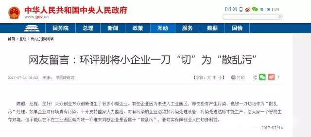 陳超:總理,您好!大眾創(chuàng)業(yè)萬眾創(chuàng)新催生了很多小微企業(yè)。有些企業(yè)因為未進(jìn)入工業(yè)園區(qū),即使沒有產(chǎn)生污染,也被一刀切地作為“散亂污”處理。如果企業(yè)對環(huán)境真有污染,十分支持國家大力整治。對有污染的企業(yè)必須加污染處理設(shè)備,污染處理達(dá)標(biāo)才能生產(chǎn),給大家一個好的生存環(huán)境。但不能以在不在工業(yè)園區(qū)做為唯一標(biāo)準(zhǔn)來判斷企業(yè)是否屬于“散亂污”,要切實保障創(chuàng)業(yè)人的切身利益。