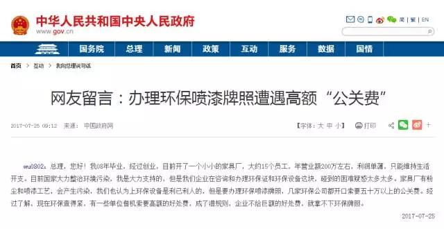 wu0802:總理,您好!我08年畢業(yè),經(jīng)過創(chuàng)業(yè),目前開了一個小小的家具廠,大約15個員工,年營業(yè)額200萬左右,利潤單薄,只能維持生活開支。目前國家大力整治環(huán)境污染,我是大力支持的,但是我們企業(yè)在咨詢和辦理環(huán)保證和環(huán)保設(shè)備這塊,碰到的困難疑惑太多太多。家具廠有粉塵和噴漆工藝,會產(chǎn)生污染,我們也認(rèn)為上環(huán)保設(shè)備是利已利人的,但是要辦理環(huán)保噴漆牌照,幾家環(huán)保公司都開口索要五十萬以上的公關(guān)費。經(jīng)過了解,現(xiàn)在環(huán)保查得緊,有一些單位借機(jī)索要高額的好處費,成了潛規(guī)則,企業(yè)不給巨額的好處費,就拿不下環(huán)保牌照。