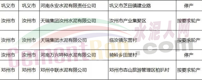 六、鄧州中聯(lián)水泥有限公司熟料生產(chǎn)線及汝州市三家水泥企業(yè)中位于騎嶺鄉(xiāng)田堂村的河南萬興特種水泥有限公司將按要求于2017年11月15日至2018年3月5日錯(cuò)峰停產(chǎn)。其余兩家(1位于汝州市產(chǎn)業(yè)集聚區(qū)的天瑞集團(tuán)汝州水泥有限公司;2 位于臨汝鎮(zhèn)東營村的天瑞集團(tuán)水泥有限公司)按要求輪產(chǎn)。
