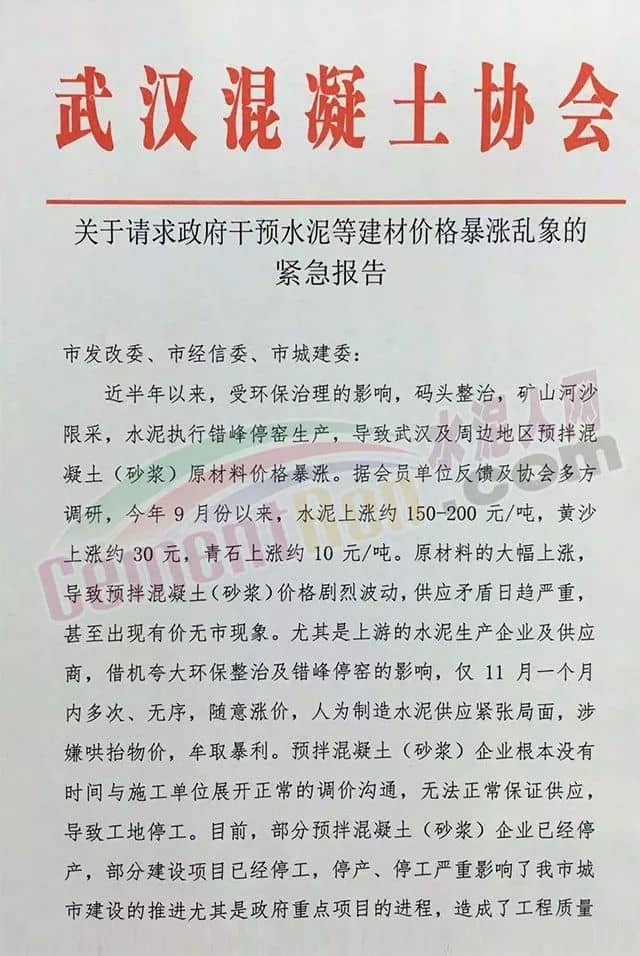 報(bào)告稱,近半年以來,受環(huán)保治理的影響,碼頭整治、礦山河沙限采,水泥執(zhí)行錯峰停窯生產(chǎn),導(dǎo)致武漢及周邊地區(qū)預(yù)拌混凝土(砂漿)原材料價(jià)格暴漲。