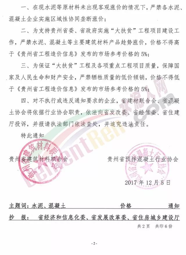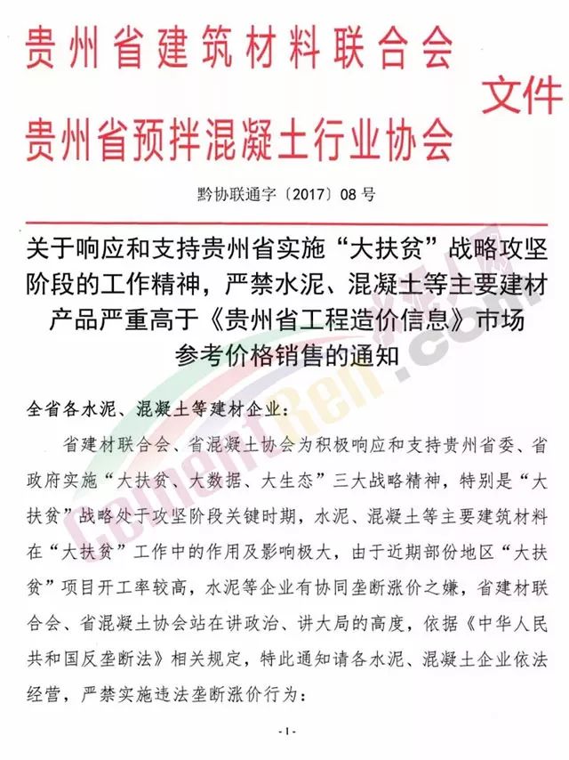 昨日(5日)貴州省建筑材料聯(lián)合會,貴州省預(yù)拌混凝土行業(yè)協(xié)會發(fā)布《關(guān)于響應(yīng)和支持貴州實(shí)施”大扶貧“戰(zhàn)略攻堅(jiān)階段的工作精神,嚴(yán)禁水泥、混凝土等主要建材產(chǎn)品嚴(yán)重高于《貴州省工程造價(jià)信息》市場參考價(jià)格銷售的通知。通知稱:省建材聯(lián)合會、省混凝土協(xié)會為積極響應(yīng)和支持貴州省委、省政府實(shí)施“大扶貧、大數(shù)據(jù)、大生態(tài)”三大戰(zhàn)略精神,特別是“大扶貧”戰(zhàn)略處于攻堅(jiān)階段關(guān)鍵時(shí)期,水泥、混凝土等主要建筑材料在“大扶貧”工作中的作用及影響極大,由于近期部分地區(qū)“大扶貧”項(xiàng)目開工率較高,水泥等企業(yè)有協(xié)同壟斷漲價(jià)之嫌,省建材聯(lián)合會、省混凝土協(xié)會站在講政治、講大局的高度,依據(jù)《中華人民共和國反壟斷法》相關(guān)規(guī)定通知各水泥‘混凝土企業(yè)依法經(jīng)營,嚴(yán)禁實(shí)施違法壟斷漲價(jià)行為。