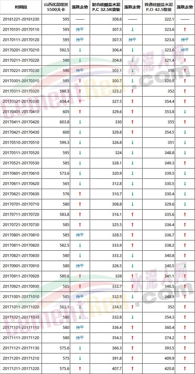 水泥人網(wǎng)同時(shí)整理了國(guó)家統(tǒng)計(jì)局發(fā)布的2017年全國(guó)從1月份到12月份水泥與煤炭每個(gè)月的均價(jià)情況如下: