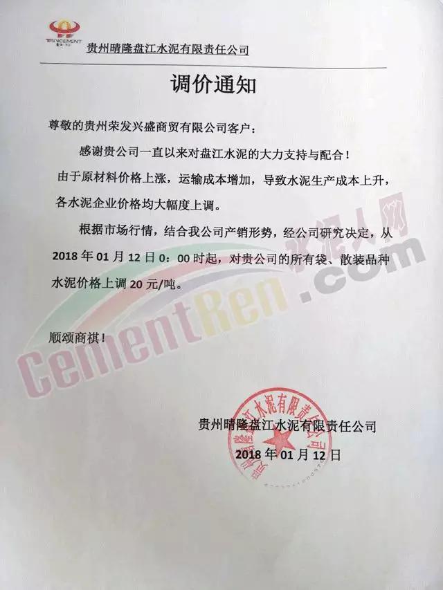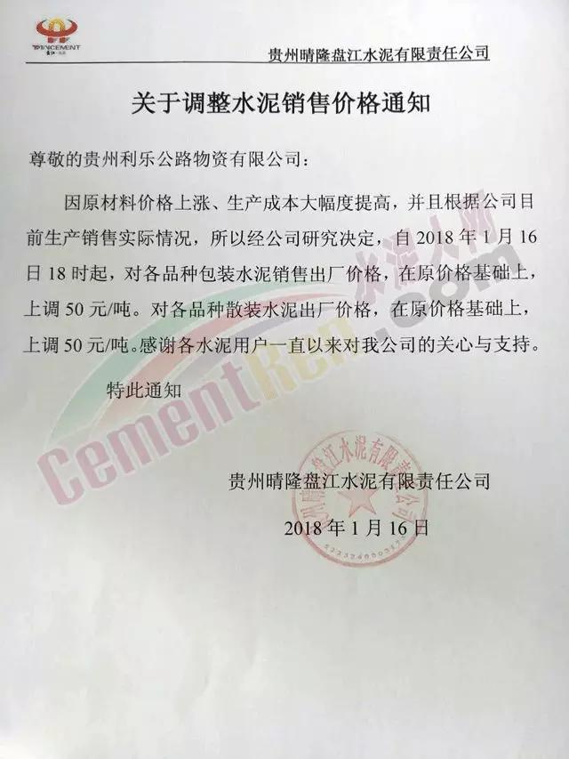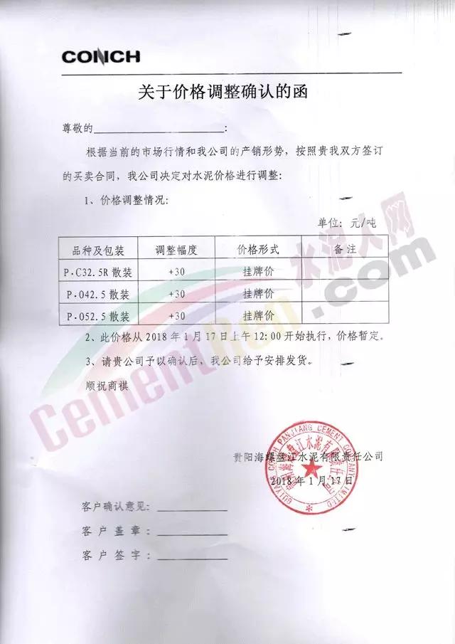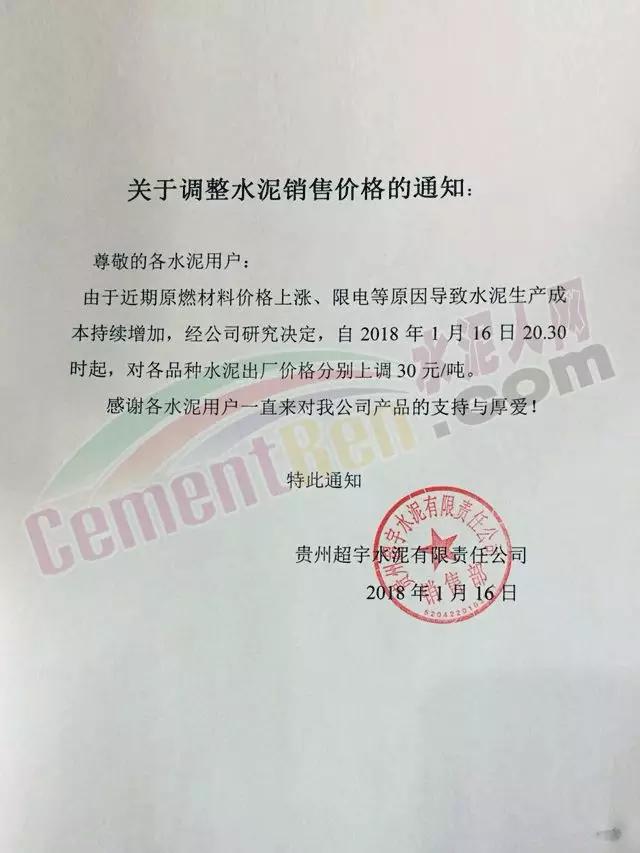通知,根據(jù)當前的市場行情和我公司的產(chǎn)銷形勢,經(jīng)公司研究決定于2018年1月17日早上8點對各品種袋裝、散裝水泥分別上調(diào)30元/噸。感謝您一直以來對我公司的支持和惠顧!順祝商祺!臺泥(安順)水泥有限公司