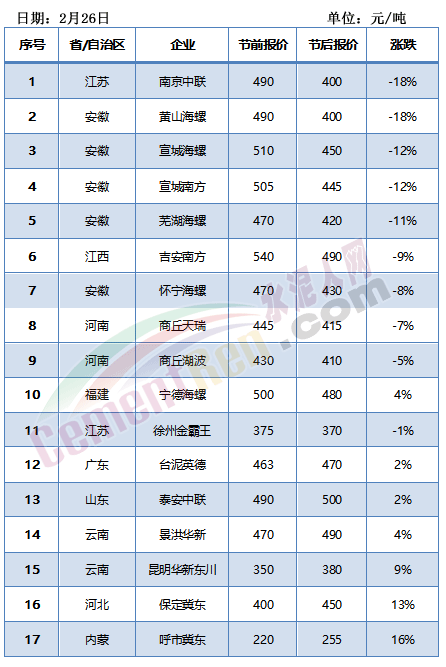 部分企業(yè)PC32.5袋裝水泥出廠報(bào)價(jià)