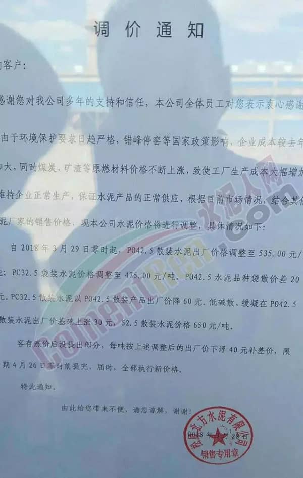 調(diào)價(jià)通知稱,客存漲價(jià)后沒有提出部分,每噸按上述調(diào)整后的出廠價(jià)下浮40元補(bǔ)差價(jià),限期4月26日零時(shí)前提完。屆時(shí),將全部執(zhí)行新價(jià)格。