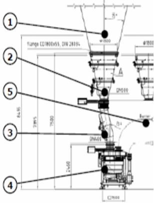靠一套通氣系統(tǒng)(2)支持,煤粉從煤粉倉(1)流出,轉(zhuǎn)子秤(4)將煤粉進行定量喂料,傳送空氣(5)從風(fēng)機中出來,并將煤粉直接吹到燃燒器。轉(zhuǎn)子秤喂料的高精度確保燃燒器中穩(wěn)定的空氣/煤粉混合。使用一個下料管(3)將煤粉倉出口與轉(zhuǎn)子秤(4)相連。