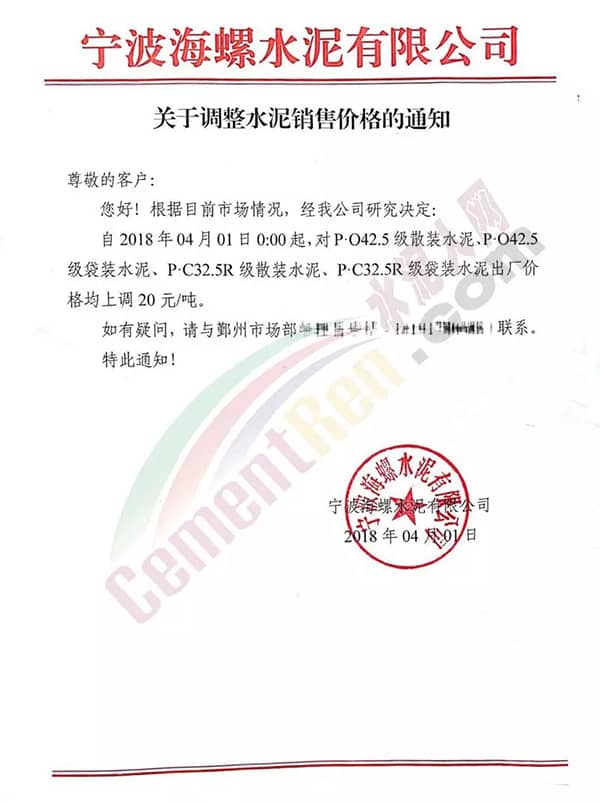 寧波海螺水泥調(diào)價(jià)通知