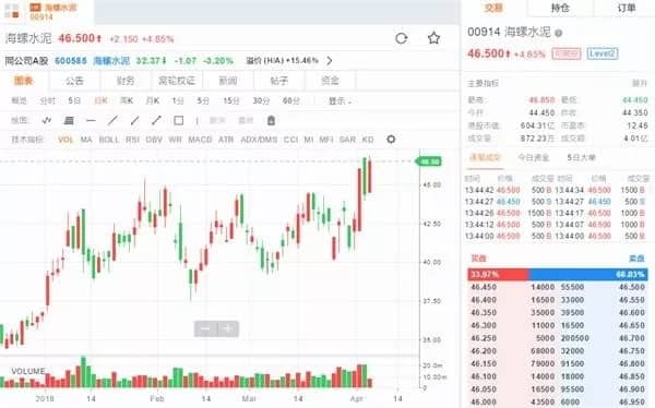 水泥價(jià)格上漲帶來了股市的好消息,4月6日海螺水泥(00914.HK)股價(jià)明顯上漲。盤中最高漲至46.85港元(約38元人民幣),刷新歷史創(chuàng)新高。