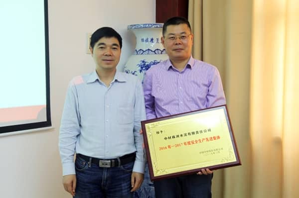 【水泥人網(wǎng)】 近日,中材股份副總裁劉標(biāo)、安全環(huán)保辦公室主任蒲太安一行,到中材株洲為企業(yè)頒發(fā)“2016-2017年度安全生產(chǎn)先進(jìn)集體”獎(jiǎng),中材水泥總經(jīng)理助理賈相華作為企業(yè)代表領(lǐng)獎(jiǎng)。