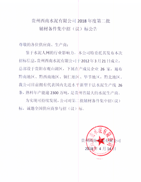貴州西南水泥有限公司是西南水泥有限公司下屬子公司,于2012年3月21日成立。貴州西南水?dāng)M定于2018年5月中旬對下屬26家成員企業(yè)2018年度輔材備件進(jìn)行集中招標(biāo),通過邀請招標(biāo)(議價(jià))選擇資質(zhì)合格、保供能力強(qiáng)、質(zhì)量及技術(shù)服務(wù)均受控的供貨單位。現(xiàn)將相關(guān)招標(biāo)采購信息發(fā)布如下: