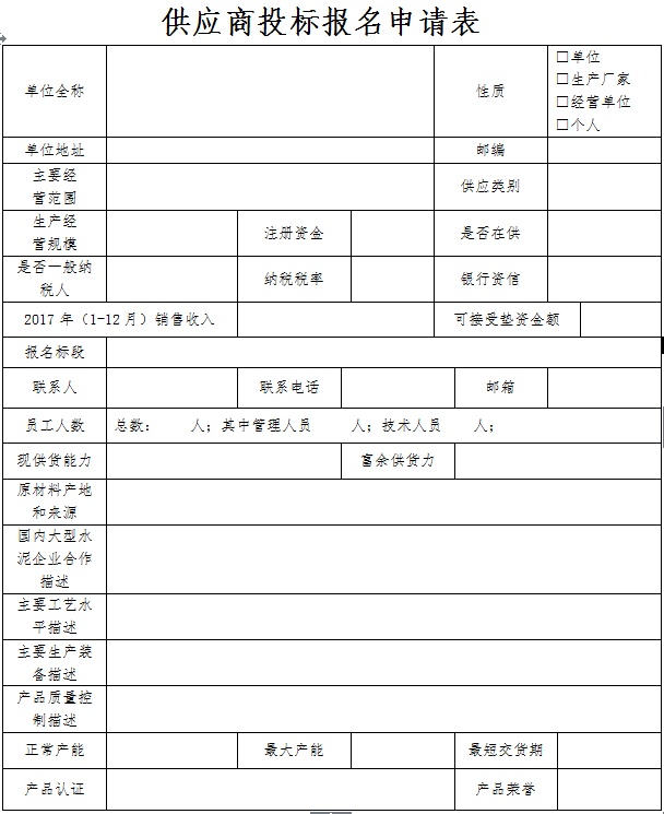 附件:貴州西南水泥2018年度輔材備件集中招(議)標(biāo)公告(供應(yīng)商投標(biāo)報(bào)名申請表)