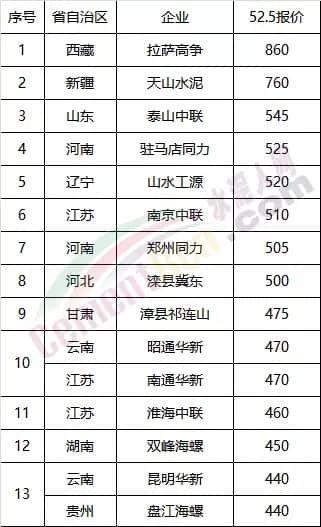 以上數(shù)據(jù)顯示,世界屋脊西藏拉薩的最高價水泥,52.5強度重點項目政府指導(dǎo)價在800元/噸,非重點項目出廠價格最高在860元/噸。那么,除西藏地區(qū)外,還有哪些區(qū)域水泥價格能夠與西藏地區(qū)比肩的呢?水泥人網(wǎng)特將各區(qū)域的“頂尖”價格綜合列表如下: