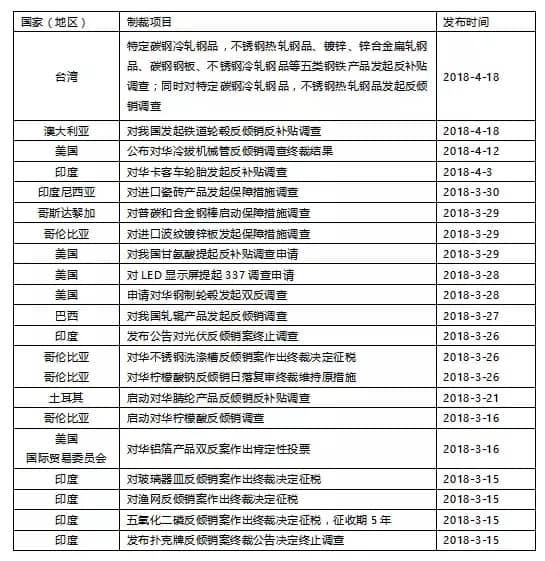 據(jù)我國商務(wù)部官網(wǎng)發(fā)布的消息統(tǒng)計,有15件針對于自我國進(jìn)口產(chǎn)品啟動反傾銷或反補貼調(diào)查。涉及臺灣地區(qū)和澳大利亞、印度、印度尼西亞、哥斯達(dá)黎加、哥倫比亞、美國、巴西、土耳其、哥倫比亞、阿根廷等國家和地區(qū)。針對于之前的調(diào)查,作為初裁、終裁等結(jié)果的14件,涉及美國、印度、哥倫比亞、泰國、墨西哥、越南等國家;美國企業(yè)指控對美出口、在美進(jìn)口或在美銷售,侵犯其專利權(quán)請求美國際貿(mào)易委員會發(fā)布普遍排除令和禁止令的共3件,