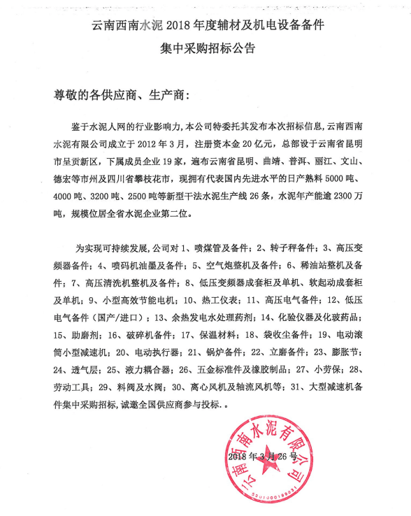 鑒于水泥人網(wǎng)的行業(yè)影響力,本公司特委托其發(fā)布本次招標信息,云南西南水泥有限公司成立于2012年3月,注冊資本金20億元,總部設于云南省昆明市呈貢新區(qū),下屬成員企業(yè)19家,遍布云南省昆明、曲靖、普洱、麗江、文山、德宏等市州及四川省攀枝花市,現(xiàn)擁有代表國內(nèi)先進水平的日產(chǎn)熟料5000噸、4000噸、3200噸、2500噸等新型干法水泥生產(chǎn)線26條,水泥年產(chǎn)能逾2300萬噸,規(guī)模位居全省水泥企業(yè)第二位。