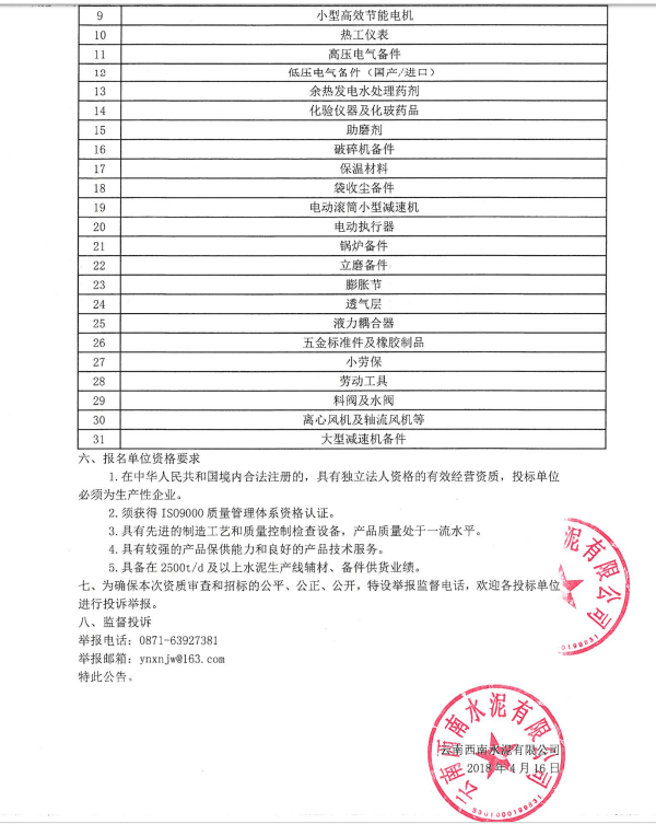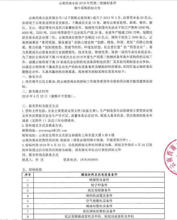 【水泥人網(wǎng)】云南西南水泥有限公司(以下簡稱云南西南)成立于2012年3月,注冊資本金20億元,總部設(shè)于云南省昆明市呈貢新區(qū),下屬成員企業(yè)19家,遍布云南省昆明、曲靖、普洱、麗江、文山、德宏等市州及四川省攀枝花市,現(xiàn)擁有代表國內(nèi)先進水平的日產(chǎn)熟料5000噸、4000噸、3200噸、2500噸等新型干法水泥生產(chǎn)線26條,水泥年產(chǎn)能逾2300萬噸,規(guī)模位居全省水泥企業(yè)第二位。云南西南目前資產(chǎn)總額達145億元,擁有干部員工3900余人。云南西南秉承“善用資源、服務(wù)建設(shè)”的核心理念和“創(chuàng)新、績效、和諧、責(zé)任”的核心價值觀,努力創(chuàng)建“創(chuàng)新績效型、資源節(jié)約型、環(huán)境友好型、社會責(zé)任型”的“四型企業(yè)”,著力發(fā)展成為云南省水泥行業(yè)規(guī)模領(lǐng)先、技術(shù)先進、管理優(yōu)秀、效益一流的專業(yè)化水泥企業(yè)。為了做好云南西南下屬19家成員企業(yè)2017年度生產(chǎn)用第二批輔材備件集中采購的招議標(biāo)工作,誠邀云南西南下屬19家成員企業(yè)的機電設(shè)備原制造供貨廠及其它同類制造企業(yè)參加,以滿足云南西南下屬成員企業(yè)生產(chǎn)的機電設(shè)備備件及輔助材料的需求,共同打造云南西南長期穩(wěn)定合作、互惠共贏的供應(yīng)商渠道?,F(xiàn)將相關(guān)招標(biāo)采購信息發(fā)布如下: