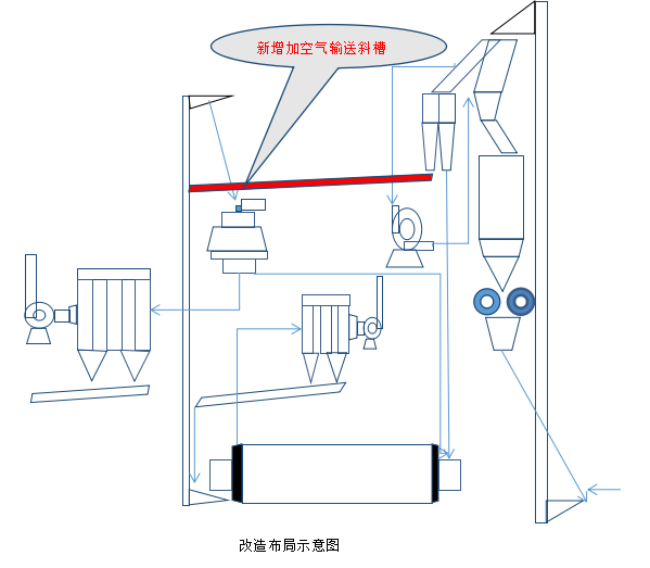 根據(jù)1#磨系統(tǒng)的旋風(fēng)筒(雙筒)收集的物料分析,有30-40%的成品進(jìn)入磨內(nèi)再粉磨,形成了磨機(jī)過(guò)粉磨現(xiàn)象。對(duì)旋風(fēng)筒(雙筒)的物料走向進(jìn)行改造,把兩個(gè)旋風(fēng)筒其中的一個(gè)用斜槽把物料送到磨尾斗提進(jìn)入選粉機(jī)進(jìn)行選粉,(由于受磨尾500斗提提料能力的制約,暫對(duì)一個(gè)旋風(fēng)筒的物料接斜槽改入磨尾500斗提,)直接經(jīng)選粉機(jī)進(jìn)入成品。