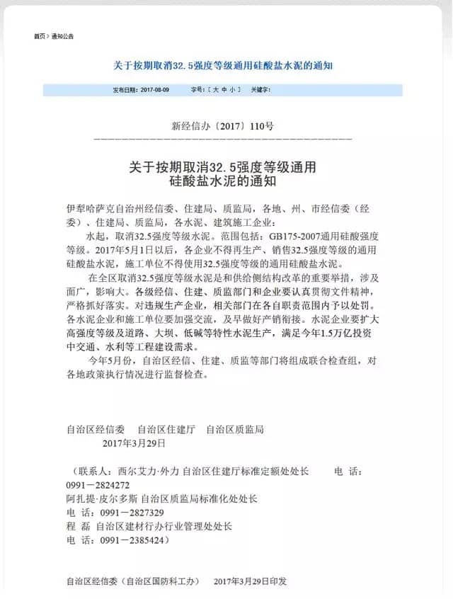 新疆自2017年5月1日起,全面停止生產(chǎn)、銷售32.5強(qiáng)度等級的通用硅酸鹽水泥,施工單位不得使用32.5強(qiáng)度等級的通用硅酸鹽水泥。