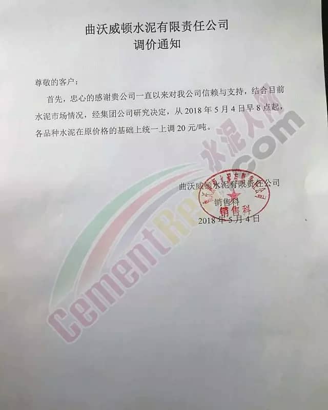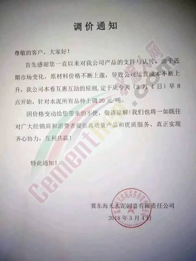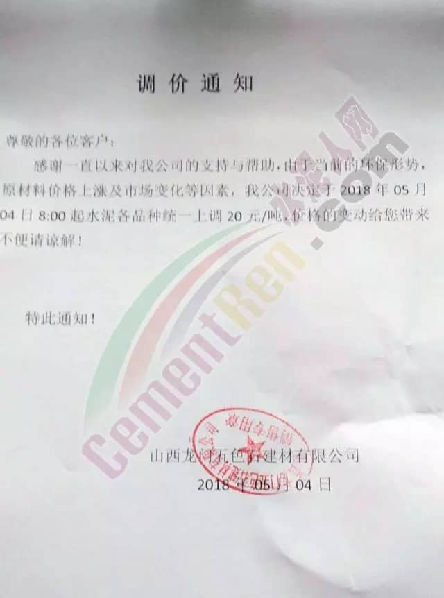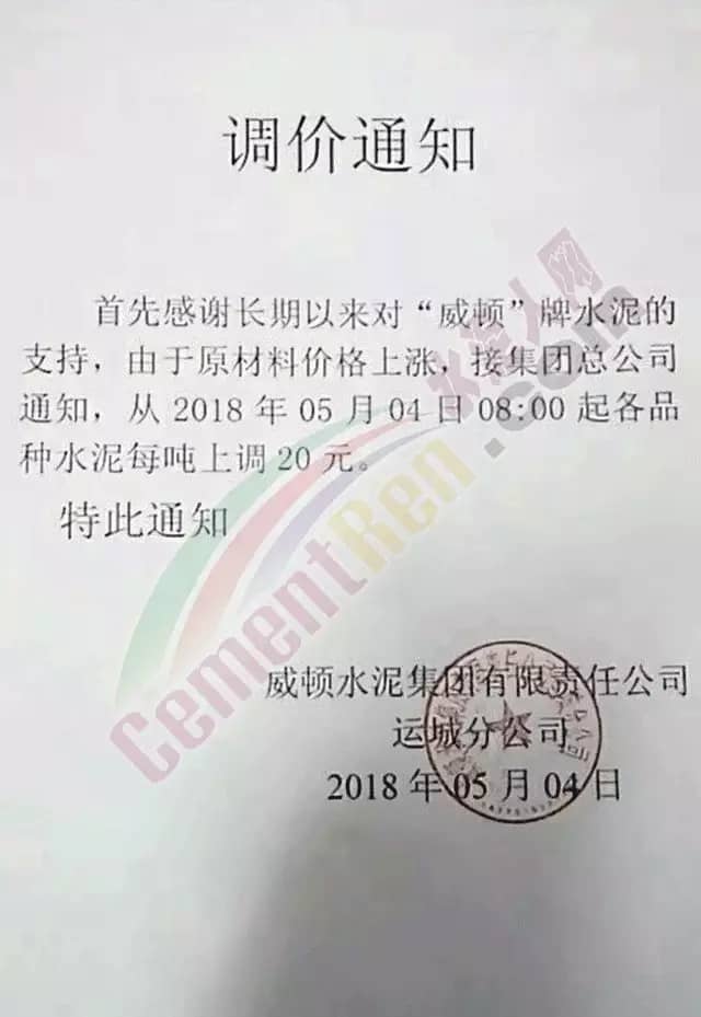 水泥人網(wǎng)5月4日消息,山西南部地區(qū)(晉南)多家企業(yè)通知下游客戶各標(biāo)號水泥在原價(jià)格基礎(chǔ)上上調(diào)20元/噸。