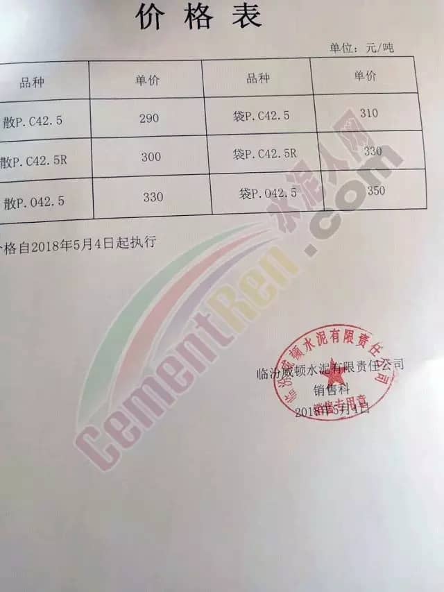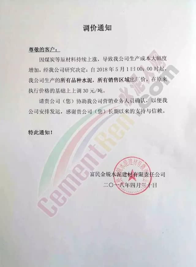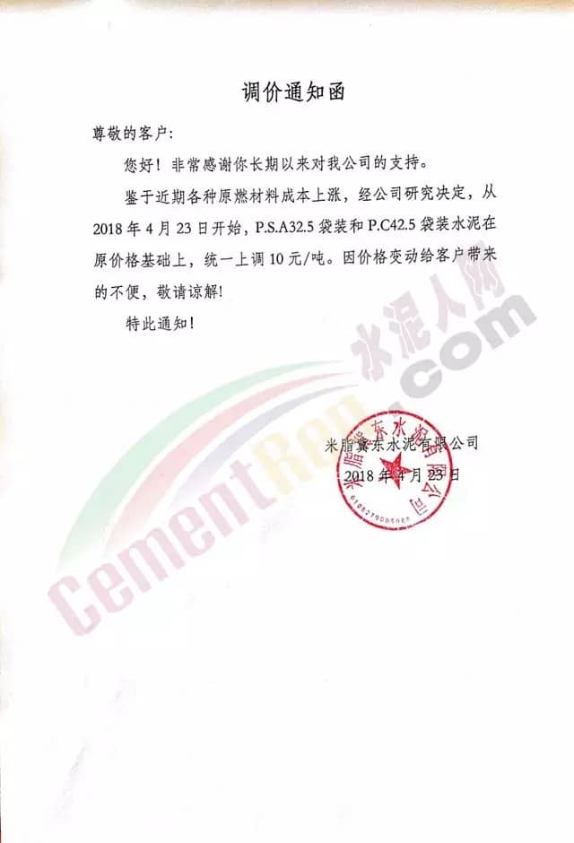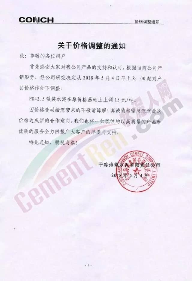 同期,甘肅平?jīng)龊B菟嗤ㄖ掠慰蛻?,根?jù)當(dāng)前公司的產(chǎn)銷形勢,PO42.5散裝水泥在原價(jià)基礎(chǔ)上上調(diào)15元/噸。
