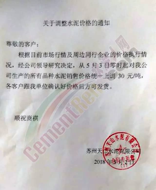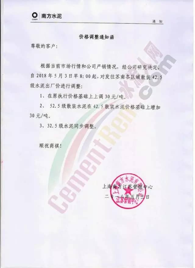 華東蘇南區(qū)域于5月3日上調(diào)水泥價(jià)格,漲幅在30元/噸。其中上海南方水泥江蘇營銷中心發(fā)布通知稱,根據(jù)市場行情和公司產(chǎn)銷情況,發(fā)往蘇南各區(qū)域散裝42.5水泥出廠價(jià)在原執(zhí)行價(jià)格基礎(chǔ)上上調(diào)30元/噸 。