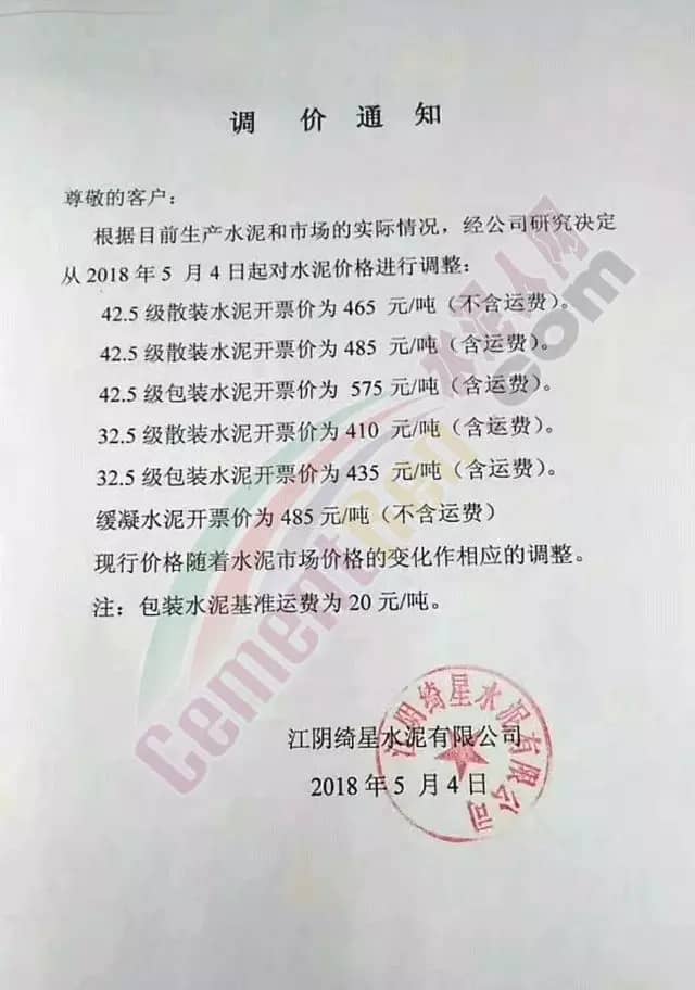 江陰綺星水泥有限公司5月4日調(diào)價(jià)通知顯示 ,42.5級袋裝水泥開票價(jià)為575元/噸(含運(yùn)費(fèi))。 據(jù)查詢,江陰綺星水泥有限公司位于江蘇省江陰市云亭鎮(zhèn)綺山,為單體粉磨站企業(yè),關(guān)鍵設(shè)備為Φ3.8×13m水泥磨1臺。