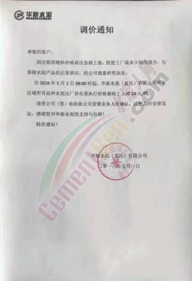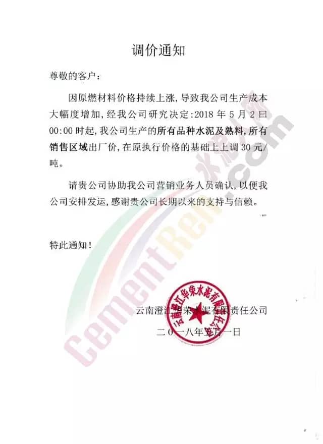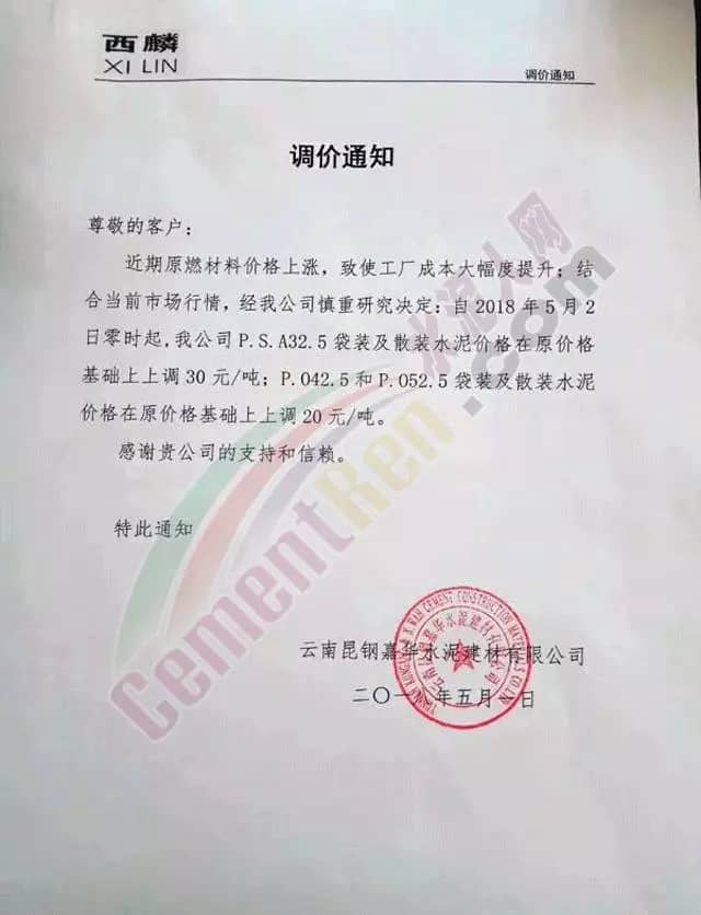 據(jù)水泥人網(wǎng)了解,自5月1日以來,大昆明區(qū)域,華新水泥、昆鋼嘉化等多家水泥企業(yè)通知上調(diào)水泥價(jià)格,漲幅在30元/噸。
