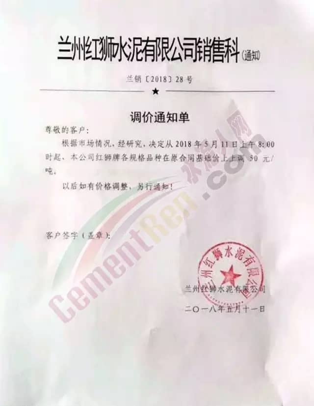 祁連山水泥針對蘭州區(qū)域的下游客戶發(fā)出通知稱,因受原材料價格上漲影響,考慮目前市場需求及庫存情況,經(jīng)公司研究決定,自5月11日零時起對永登公司、蘭州商砼公司、永固公司各品種水泥出廠價在現(xiàn)有價格基礎(chǔ)上上調(diào)50元/噸。