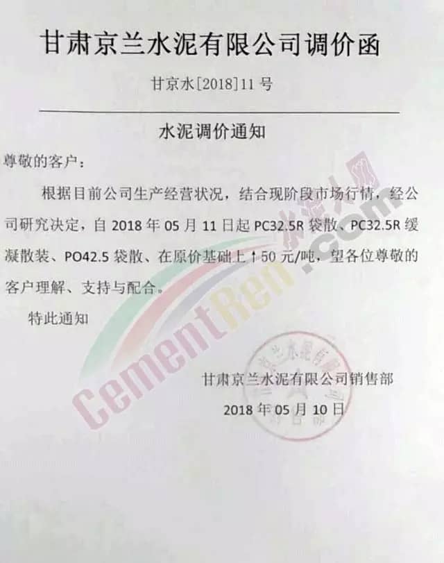 甘肅永固特種水泥有限公司調(diào)價通知稱,由于近期原材料價格上漲原因,經(jīng)公司研究決定自5月11日零點起,各型號水泥出廠價格在原基礎(chǔ)上上調(diào)50元/噸。