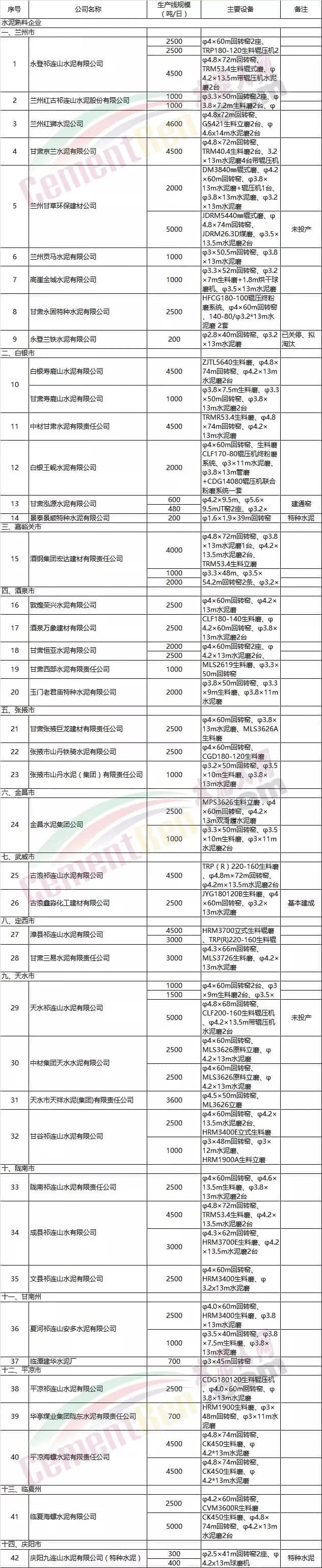 備注:數(shù)據(jù)來源水泥人網(wǎng)信息中心,表中設(shè)計產(chǎn)能為4500t/d熟料生產(chǎn)線多已技改完成,現(xiàn)日產(chǎn)量在5000t/d以上;2500t/d熟料生產(chǎn)線除永登祁連山兩條2500t/d熟料生產(chǎn)線外,其他均已技改完成,日產(chǎn)量在3000t/d以上。
