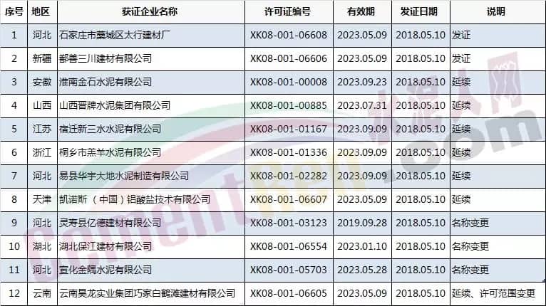 表1:質(zhì)檢總局發(fā)放2018年5月第一批水泥生產(chǎn)許可證企業(yè)名單