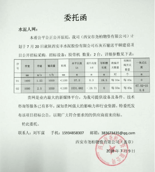 昨日(7月9日),西安堯柏物資有限公司致函水泥人網(wǎng),鑒于水泥人網(wǎng)是業(yè)內(nèi)最大的新媒體平臺,在水泥行業(yè)有著很大的影響力和行業(yè)資源,特委托對2臺膠帶機(jī)的項目進(jìn)行采購。