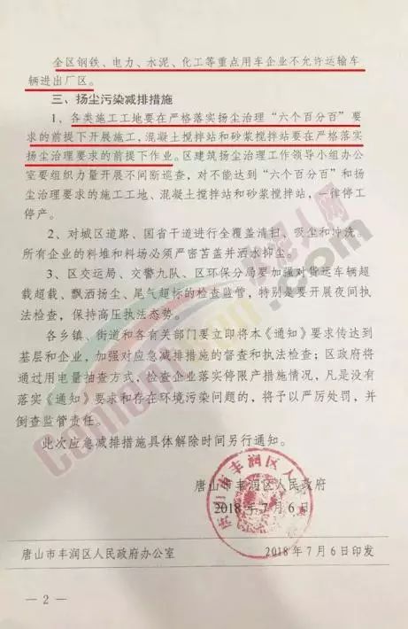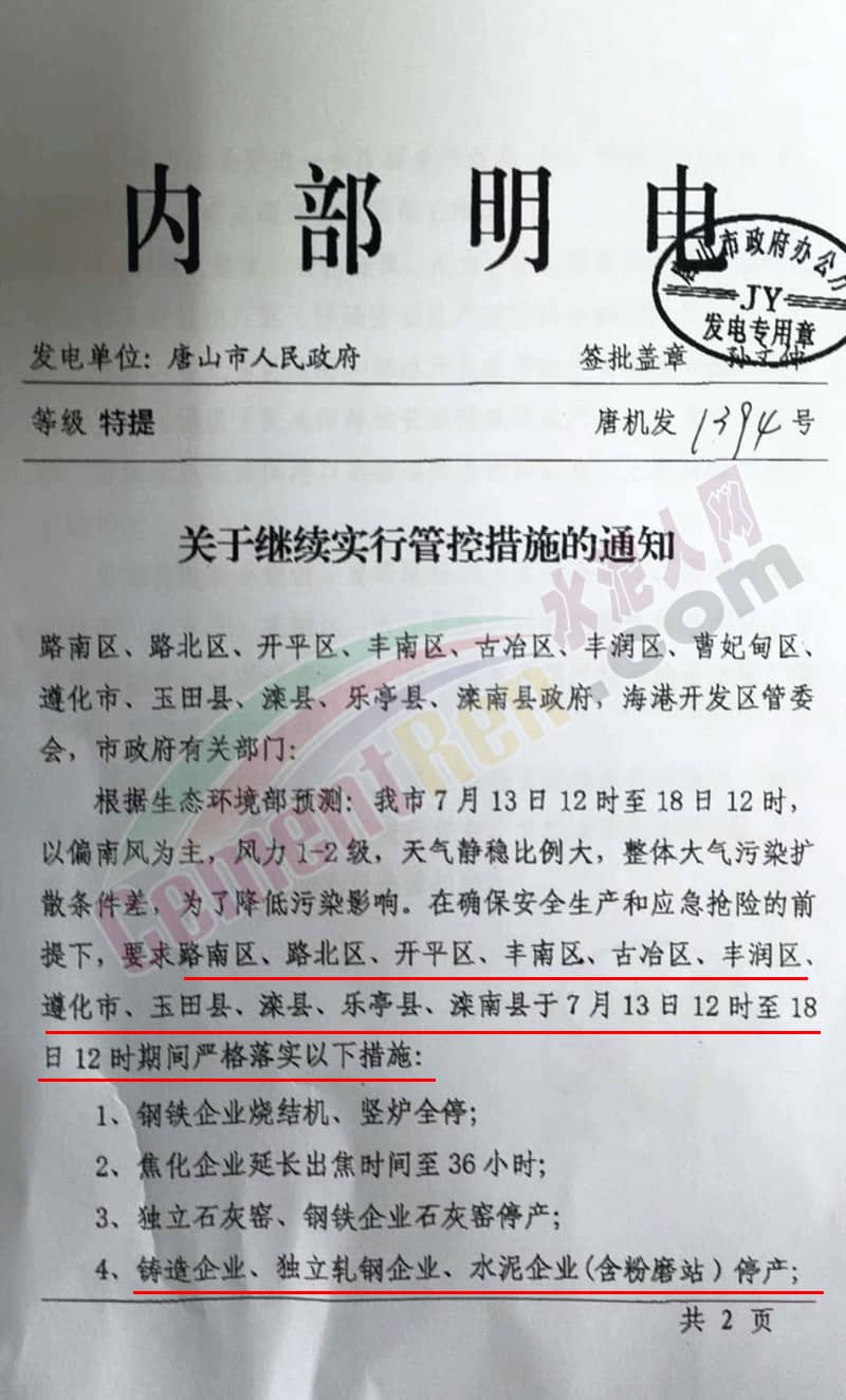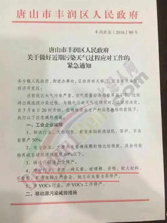 此次唐山市政府為何發(fā)出如此嚴(yán)厲的文件,不得不從前幾日的停產(chǎn)文件說(shuō)起,7月6日唐山市豐潤(rùn)區(qū)人民政府發(fā)布關(guān)于做好近期污染天氣過(guò)程應(yīng)對(duì)工作的緊急通知,要求豐潤(rùn)區(qū)所屬水泥企業(yè)全部停產(chǎn)(文件如下):