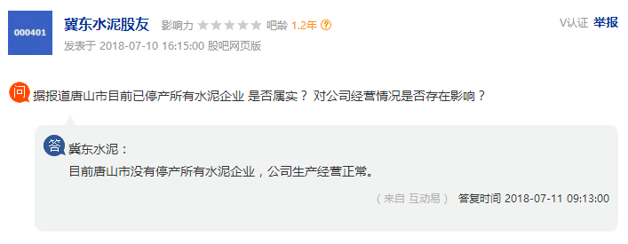 可是在文件發(fā)出以后,豐潤(rùn)區(qū)的水泥龍頭企業(yè)冀東竟然在投資者平臺(tái)上回應(yīng):唐山市沒(méi)有停產(chǎn)所有水泥企業(yè),公司生產(chǎn)經(jīng)營(yíng)一切正常。