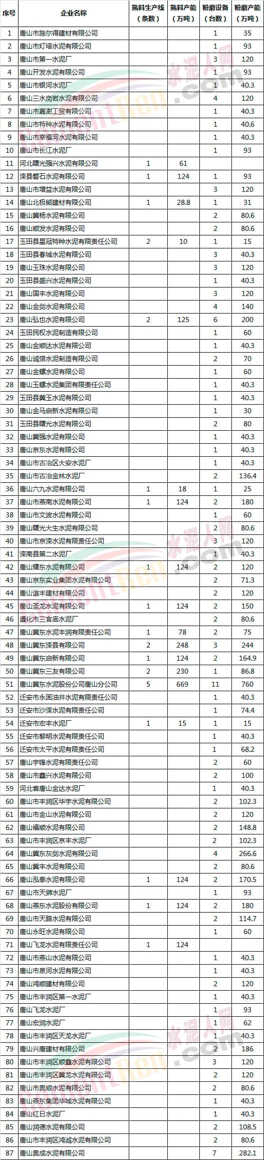 附: 唐山市水泥企業(yè)名單