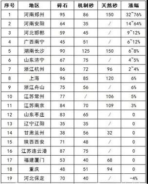 在以上19個(gè)地區(qū)砂石價(jià)格漲幅表中,11個(gè)城市砂石價(jià)格環(huán)比上漲,漲幅高達(dá)76%,天然砂報(bào)價(jià)高達(dá)150元/噸。